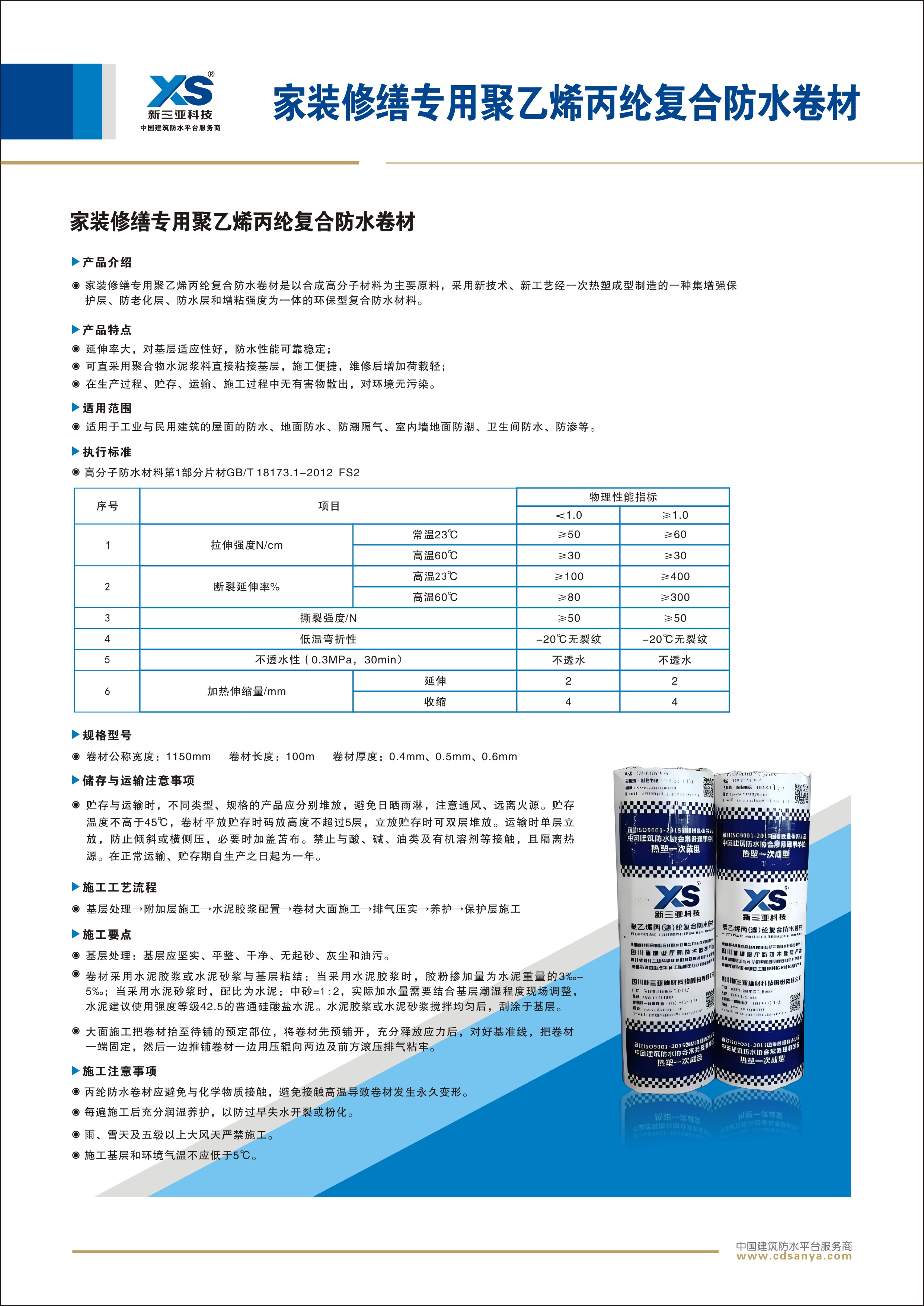 產(chǎn)品簡(jiǎn)介: 乙烯丙綸復(fù)合防水卷材是以合成高分子材料為主要原料,采用新技術(shù)、新工藝經(jīng)一次熱塑成型制造的一種集增強(qiáng)保護(hù)層、防老化層、防水層和增粘強(qiáng)度為一體的環(huán)保型復(fù)合防水材料。 規(guī)格: FS2-PE-0.6mm 1.15m×100m | ![]() | ![]() |