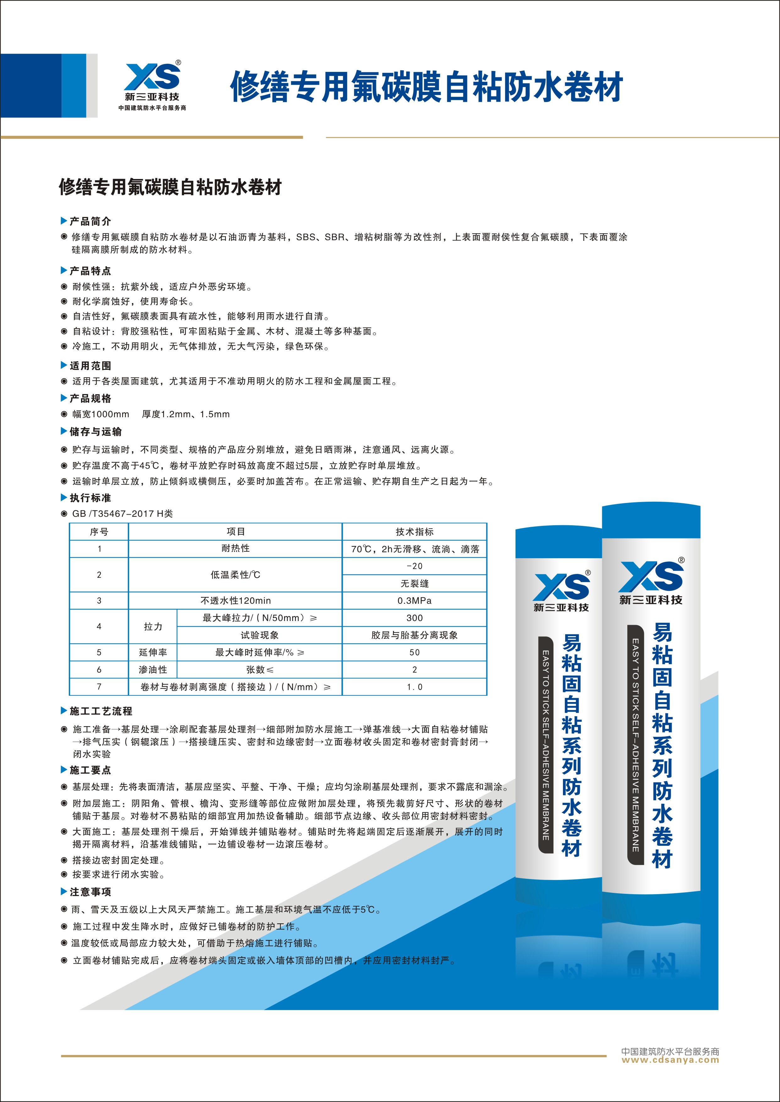 以石油瀝青為基料,SBS、SBR、增粘樹脂等為改性劑,上表面覆耐侯性復(fù)合氟碳膜,下表面覆涂硅隔離膜所制成的防水材料。
