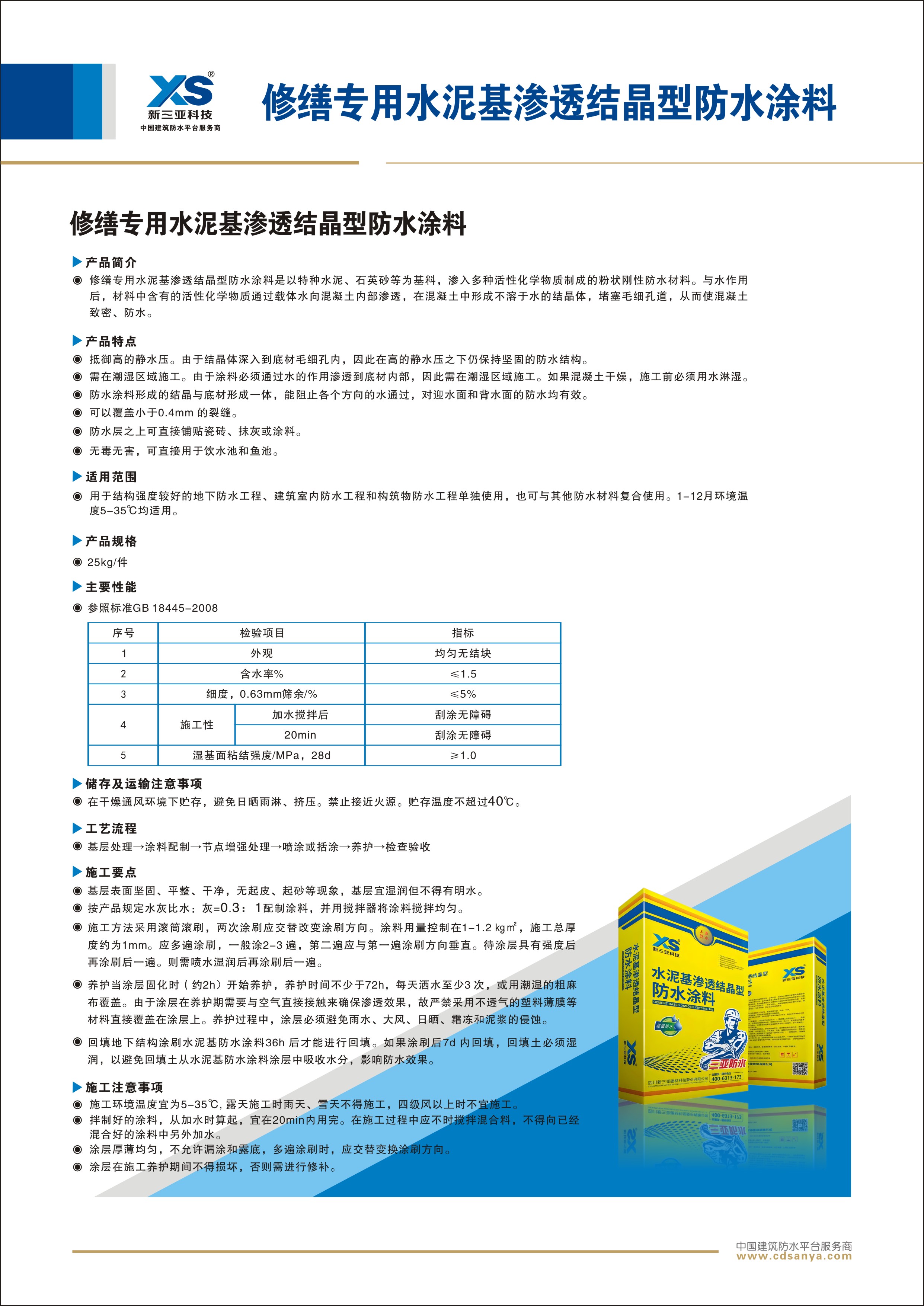 產(chǎn)品簡介: 修繕專用水泥基滲透結(jié)晶型防水涂料是以特種水泥、石英砂等為基料,滲入多種活性化學(xué)物質(zhì)制成的粉狀剛性防水材料。與水作用后,材料中含有的活性化學(xué)物質(zhì)通過載體水向混凝土內(nèi)部滲透,在混凝土中形成不溶于水的結(jié)晶體,堵塞毛細(xì)孔道,從而使混凝土致密、防水。 規(guī)格:25kg/袋 |